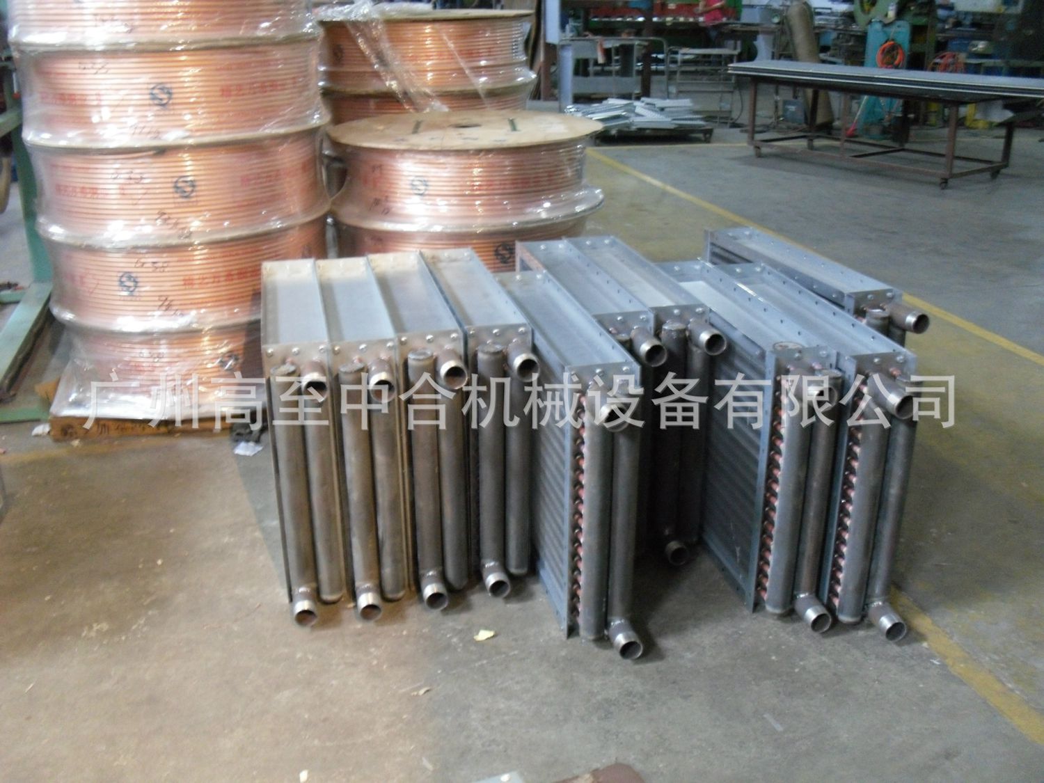 散熱管經(jīng)φ16x1.0mm紫銅管繞上10x0.2mm的紫銅帶后呈螺旋狀,翅片距有3.2mm(R)、4.2mm(M)、6.5mm(T)三種。不同的表面管長、排數(shù)、管數(shù)和不同的翅片片距能組合成多種規(guī)格型號,滿足不同工藝。
