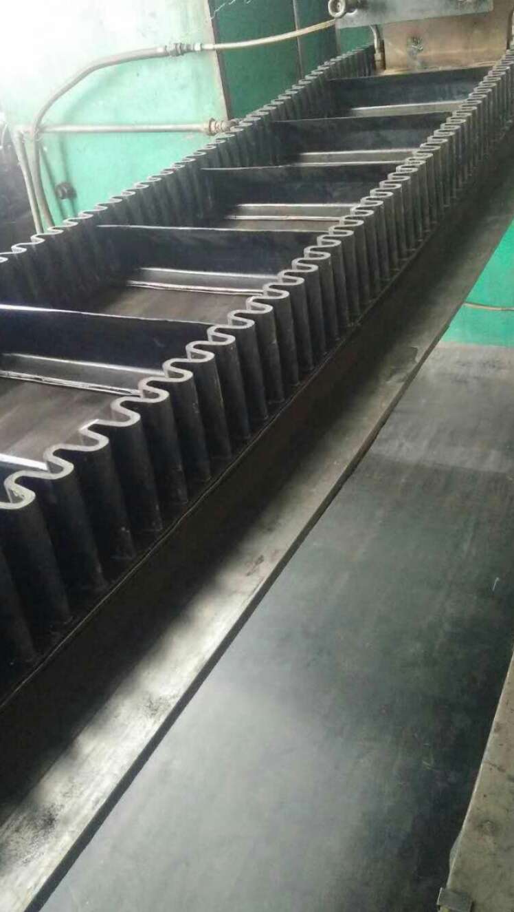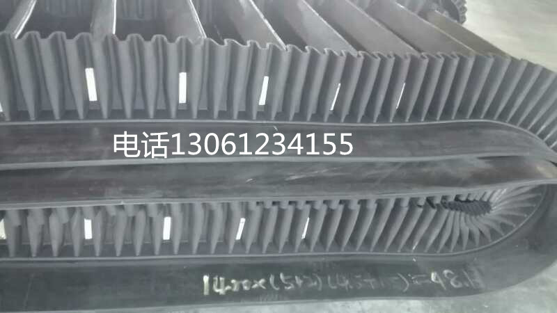 橡膠擋邊提升帶, 是由基帶、擋邊、橫隔板3部分組成。擋邊起防止物料測滑撒落的作用。為便于繞過滾筒,檔邊設(shè)計成波紋狀;橫隔板的作用是承托物料,為了實現(xiàn)大傾角輸送,采用T型TC型。檔邊和橫隔板是用二次硫化的方法與基帶連接的,具有很高的連接強度。用于輸送易散落的粉狀、粒狀、小塊狀、糊狀及液態(tài)狀物料。其特點:適用于傾角0°~90°散裝物料的輸送;具有使用范圍廣、占地面積小、無轉(zhuǎn)運點、減少土建投資、維護費用低、維修容易輸送量大連續(xù)化、高效率、大傾角運輸,操作安全,使用簡便,,運費低廉,并能縮短運輸距離,降低工程造價,節(jié)省人力物力等特點;解決了普通帶和花紋帶所不能達到的輸送角度;還可根據(jù)使用環(huán)境,設(shè)計成完整、獨立的輸送系統(tǒng),避免了間斷輸送和復雜輸送的提升系統(tǒng)。可沿水平、傾斜、垂直和變角方向輸送各種散裝物料,從煤、礦石、沙子到化肥和糧食等。物料粒度不限,可從很小的粒度到400mm的大粒度,輸送量可從1立方米/小時到6000立方米/小時。