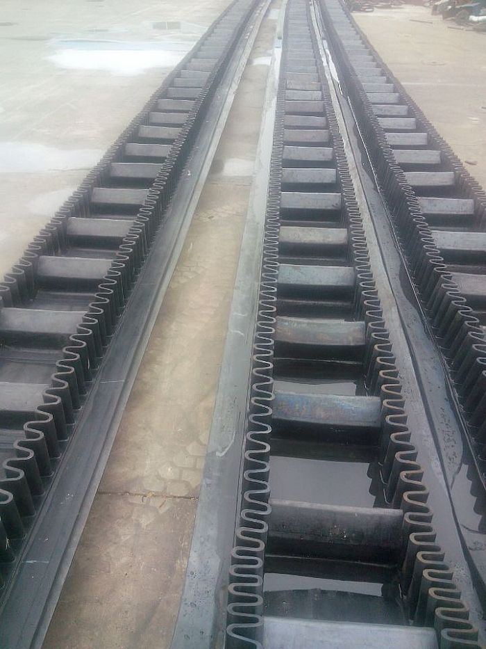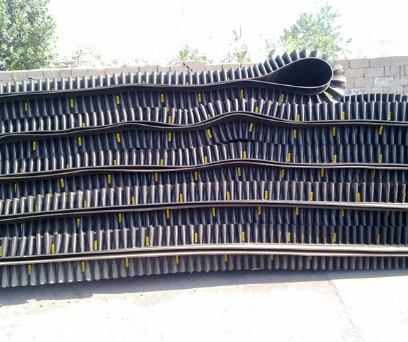 大傾角擋邊帶又叫裙邊隔板輸送帶, 是由基帶、擋邊、橫隔板3部分組成。擋邊起防止物料測(cè)滑撒落的作用。為便于繞過(guò)滾筒,檔邊設(shè)計(jì)成波紋狀;橫隔板的作用是承托物料,為了實(shí)現(xiàn)大傾角輸送,采用T型TC型。檔邊和橫隔板是用二次硫化的方法與基帶連接的,具有很高的連接強(qiáng)度。用于輸送易散落的粉狀、粒狀、小塊狀、糊狀及液態(tài)狀物料。其特點(diǎn):適用于傾角0°~90°散裝物料的輸送;具有使用范圍廣、占地面積小、無(wú)轉(zhuǎn)運(yùn)點(diǎn)、減少土建投資、維護(hù)費(fèi)用低、維修容易輸送量大 連續(xù)化、高效率、大傾角運(yùn)輸,操作安全,使用簡(jiǎn)便,,運(yùn)費(fèi)低廉,并能縮短運(yùn)輸距離,降低工程造價(jià),節(jié)省人力物力等特點(diǎn);解決了普通帶和花紋帶所不能達(dá)到的輸送角度;還可根據(jù)使用環(huán)境,設(shè)計(jì)成完整、獨(dú)立的輸送系統(tǒng),避免了間斷輸送和復(fù)雜輸送的提升系統(tǒng)??裳厮?、傾斜、垂直和變角方向輸送各種散裝物料,從煤、礦石、沙子到化肥和糧食等。物料粒度不限,可從很小的粒度到
