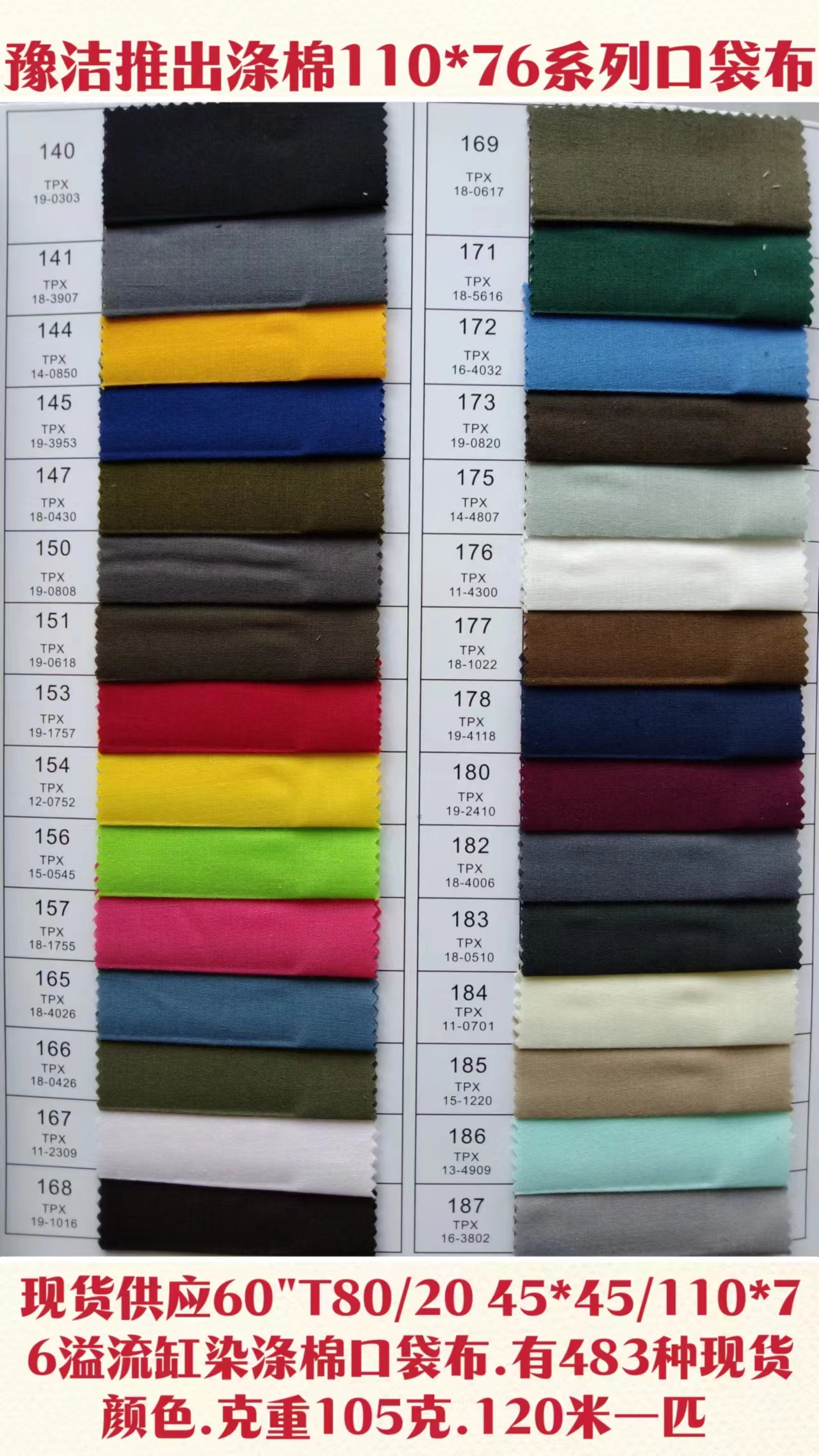 倉庫常年現(xiàn)貨供應60"T80/C20 45X45/110X76有483種顏色口袋布,